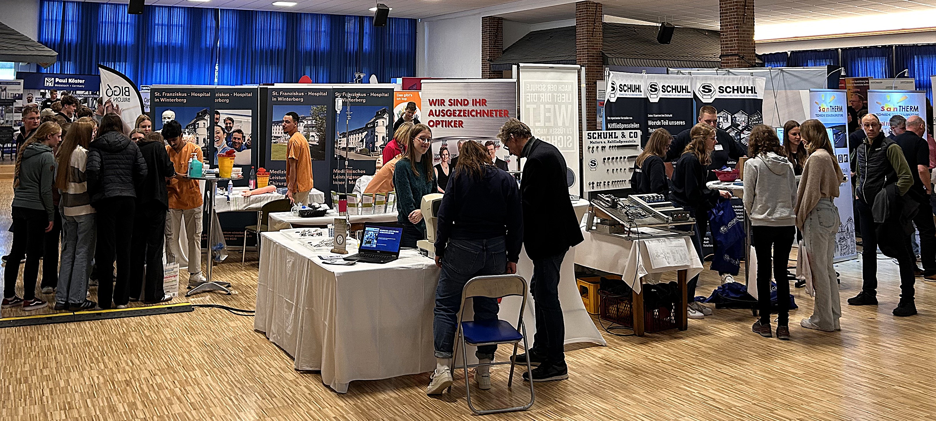 Winterberg/Niedersfeld. 41 heimische Unternehmen aus fast allen wirtschaftlichen Branchen, rund 150 Ausbildungs-Angebote und berufliche Perspektiven sowie 500 Schülerinnen und Schüler der Jahrgangsstufen 8 bis 10 der Sekundarschule Medebach-Winterberg sowie des Geschwister-Scholl-Gymnasiums– eine perfekte Kombination für eine erfolgreiche 8. Interkommunale Ausbildungsmesse, die die Städte Winterberg, Medebach und Hallenberg jetzt in der Schützenhalle Niedersfeld angeboten haben. Ein modernes Format mit vielen digitalen Elementen sowie zahlreichen Produktions-Exponaten sorgten in der Schützenhalle für ein hervorragendes Fundament, um zwischen den heimischen Betrieben und künftigen Nachwuchskräften erste Kontakte zu knüpfen, sich zu vernetzen sowie wertvolle Informationen über berufliche Karrierewege sowie Angebote seitens der Unternehmen zu transportieren.
