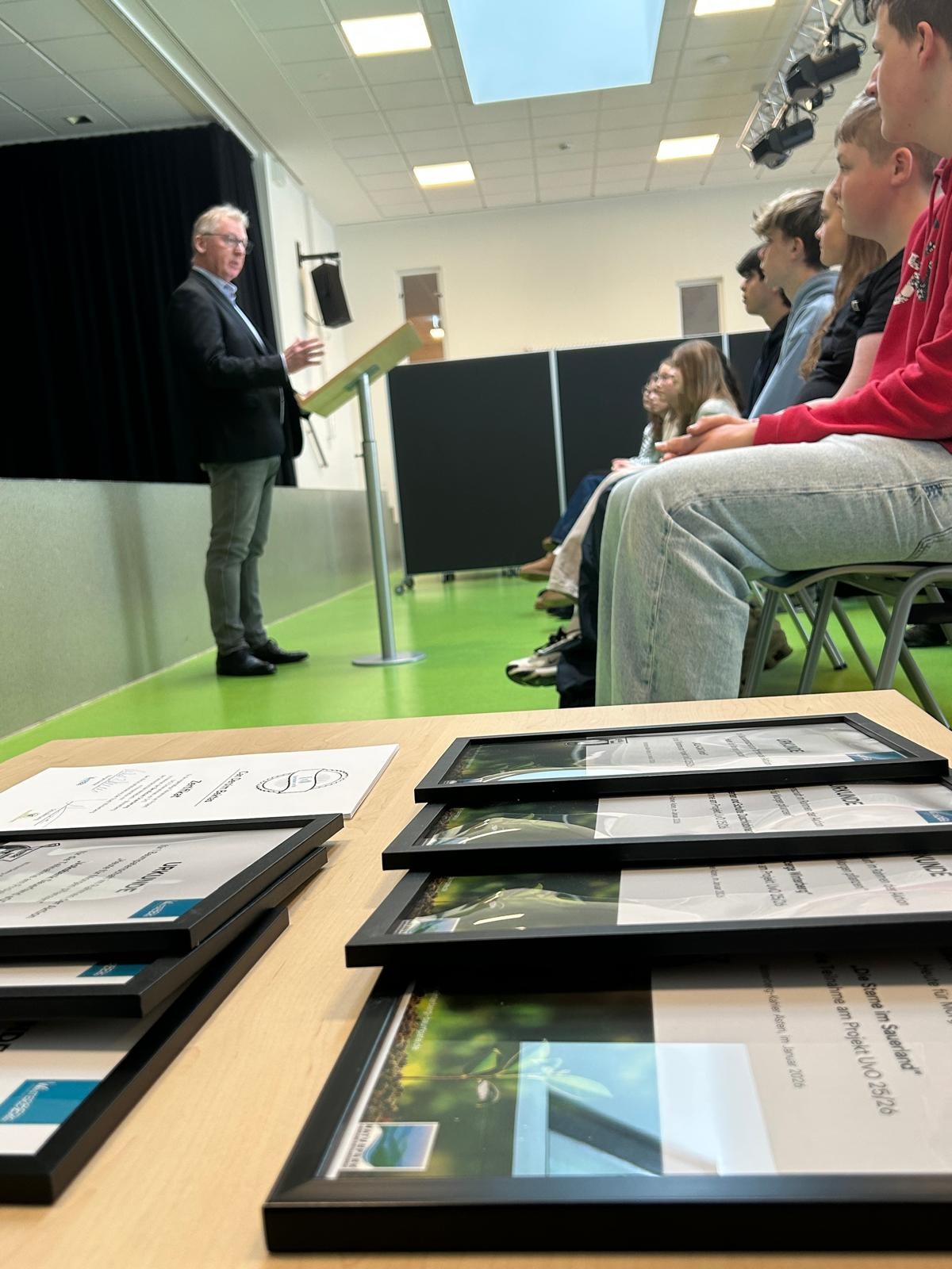 Über ein ganzes Jahr, vom zweiten Halbjahr der achten Klasse bis zum Ende des ersten Halbjahres der neunten Klasse, hatten die Jugendlichen die Gelegenheit, wertvolle und vor allem praxisnahe Einblicke in die heimische Wirtschaft zu gewinnen. Das Konzept ist so einfach wie wirkungsvoll: Unternehmen aus Winterberg und Umgebung stellen sich und ihre Ausbildungsberufe direkt in der Schule vor oder ermöglichen Besuche vor Ort. „Ein Beruf wird erst dann wirklich greifbar, wenn man ihn erlebt“, betonte Schulleiter Uwe Kruse in seiner Rede. Er lobte die Schülerinnen und Schüler für ihre Initiative mit den Worten: „Ihr habt alles richtig gemacht.“ Dieser direkte Kontakt zu Betrieben, das Erleben von Arbeitsabläufen und der Austausch mit Auszubildenden seien entscheidend für eine realistische Berufswahl. Insgesamt lernten die Schülerinnen und Schüler über 30 Ausbildungsberufe im Rahmen des Projektes kennen.