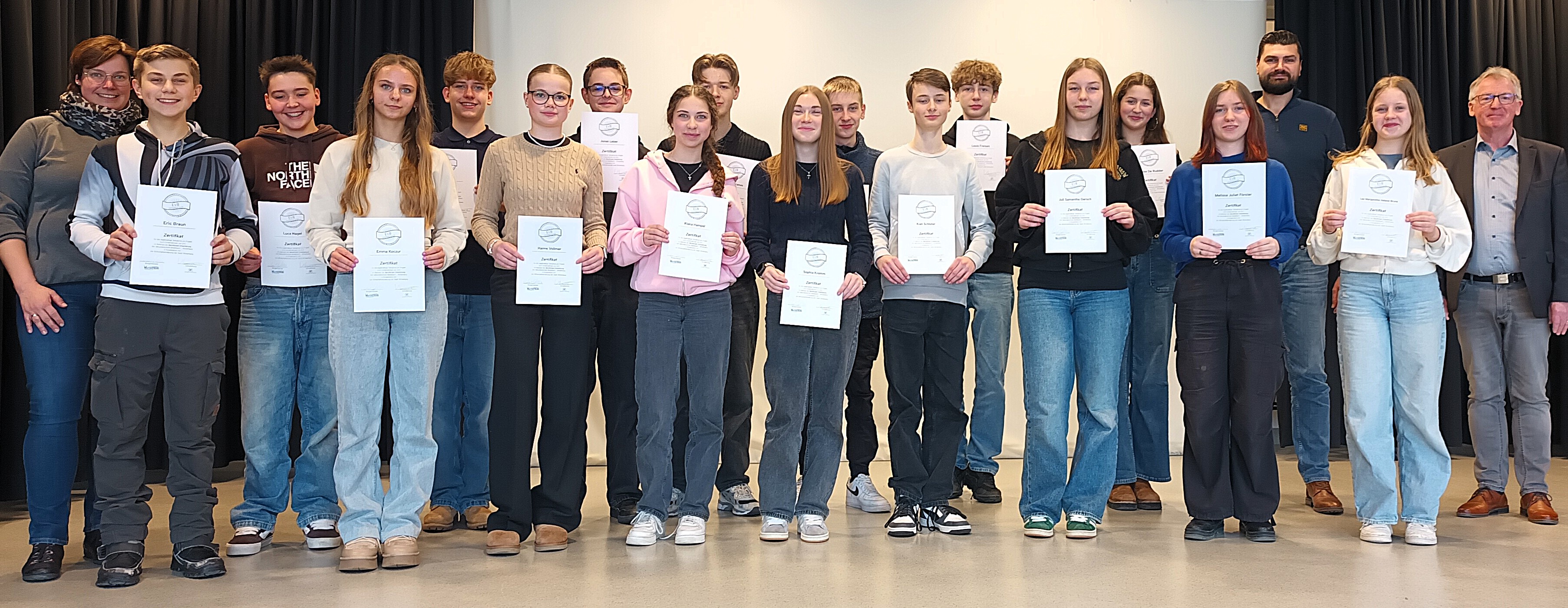 Winterberg. Was hilft gegen Fachkräfte- und Nachwuchsmangel? Gezielte Information, gute Kommunikation und der persönliche Austausch von jungen Menschen mit heimischen Unternehmerinnen und Unternehmern! Alle diese Komponenten vereint das Projekt „Unternehmen vor Ort“, welches kurz „UvO“ genannt wird. Initiiert von der Wirtschaftsförderung Winterberg, hat „UvO“ in Kooperation mit der Sekundarschule Medebach-Winterberg zum Ziel, die Schülerinnen und Schüler des 8. bzw. 9. Schuljahrgangs auf freiwilliger Basis in den direkten Kontakt mit heimischen Betrieben aus Winterberg, Medebach und Hallenberg zu bringen. Ganz konkret stellen sich die Unternehmer bei einem persönlichen Besuch den potentiellen Auszubildenden vor, informieren über ihren Betrieb, die Ausbildungsberufe und die Karrierechancen. Im direkten Austausch können so Netzwerke aufgebaut und Fragen direkt geklärt werden. Begonnen im April 2023, ist das Projekt so erfolgreich angelaufen, dass jetzt 20 Schülerinnen und Schülern das „UvO“-Zertifikat in der Sekundarschule für die erfolgreiche Teilnahme von Schulleiter Uwe Kruse sowie Christine Schulte von der Wirtschaftsförderung Winterberg überreicht wurde.