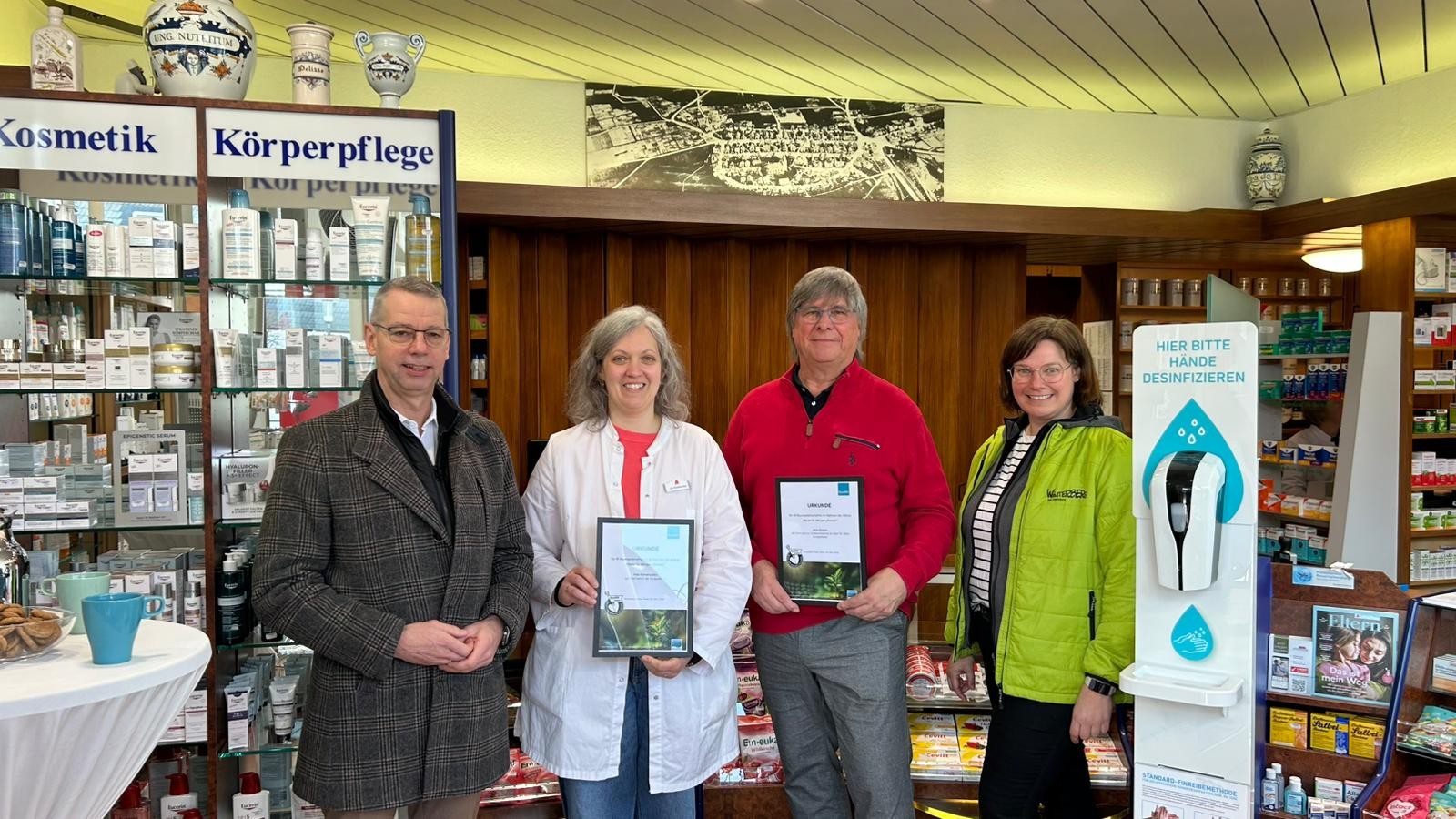 Winterberg. Nach über drei Jahrzehnten übergibt Jens Asmus die Kur-Apotheke Winterberg in neue Hände. Seine Nachfolgerin Iris Kewekordes übernimmt die traditionsreiche Apotheke und will das erfolgreiche Konzept fortführen. Bürgermeister Michael Beckmann und Christine Schulte von der Wirtschaftsförderung gratulierten beiden zum erfolgreichen Betriebsübergabe und würdigten die Bedeutung der Apotheke für die medizinische Versorgung in Winterberg.