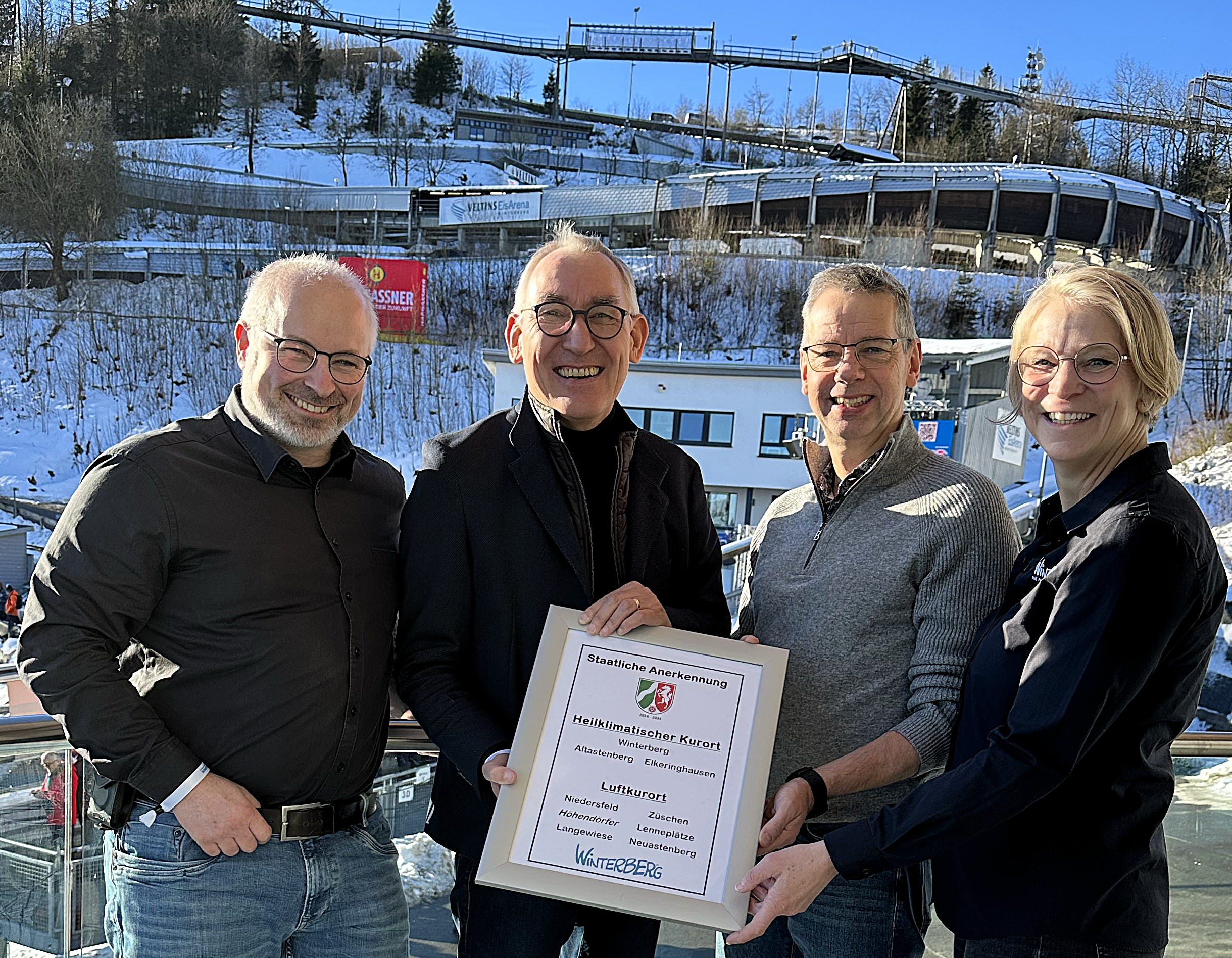 Dieser Auszeichnung gingen umfangreiche Luftmessungen und Überprüfungen der Infrastruktur durch Prof. Dr. Dr. Dipl.-Phys. Jürgen Kleinschmidt im Auftrag der Stadt Winterberg voraus. Im Rahmen der Rodel-Europameisterschaft überreichte Regierungspräsident Heinrich Böckelühr die Zertifikate an Bürgermeister Michael Beckmann, WTW-Geschäftsführer Winfried Borgmann sowie Tourismusförderin Michaela Grötecke. „Ich freue mich sehr, die gute Nachricht heute überbringen zu können. Die konstanten Bemühungen für Bürgerinnen und Bürger sowie Gäste zahlen sich aus. Meinen Glückwunsch zu der verdienten Erneuerung der Auszeichnungen“, sagt Heinrich Böckelühr bei der Übergabe der Zertifikate.