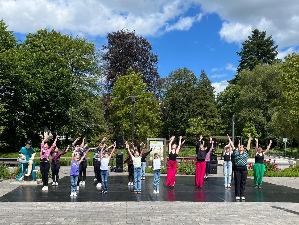 Einige der Tänzerinnen präsentierten die gerade frisch einstudierten Choreos im Anschluss an die Workshops direkt bei der offenen Tanzfläche im Kurpark Dr. Grüne. In toller Kulisse hatte das Team des Sauerlandhop ihren Tanzteppich ausgerollt und so eine 8x10 Meter große Tanzfläche in den Park gezaubert. Neben den Workshop-Präsentationen tanzten unter anderem einige Gruppen der Tanzwerkstatt Olsberg und die Rollstuhltanzgruppe des TSC Olsberg.