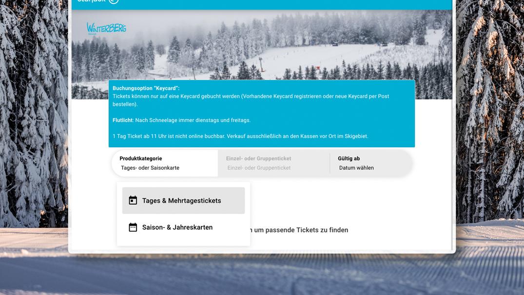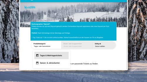 Der Kauf eines Skitickets ist übersichtlich und in wenigen Schritten erledigt. Zunächst wählst du aus, ob du ein Tages-, Mehrtages- oder Saison-Ticket buchen möchtest. Anschließend legst du das gewünschte Datum fest. Im nächsten Schritt entscheidest du dich für die Ticketvariante, etwa ob du vormittags, nachmittags, ganztägig oder zum Flutlichtfahren unterwegs sein möchtest und ob es sich um ein Kinder- oder Erwachsenen Ticket handelt.Danach loggst du dich in deinen bestehenden Account ein oder erstellst ein neues Benutzerkonto. Im Bestellprozess wird das Ticket einer Keycard zugeordnet, entweder einer bereits vorhandenen oder einer neu bestellten Karte. Nach Abschluss der Bezahlung ist das Ticket sofort digital auf der Keycard gespeichert. Am Skitag selbst entfällt so der Gang zur Liftkasse vollständig.