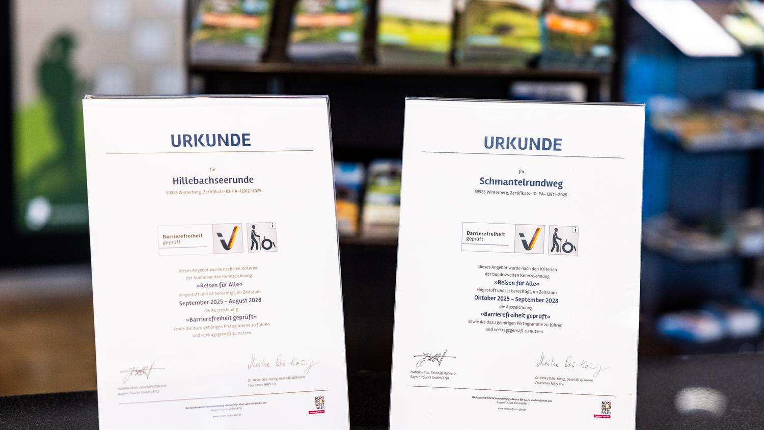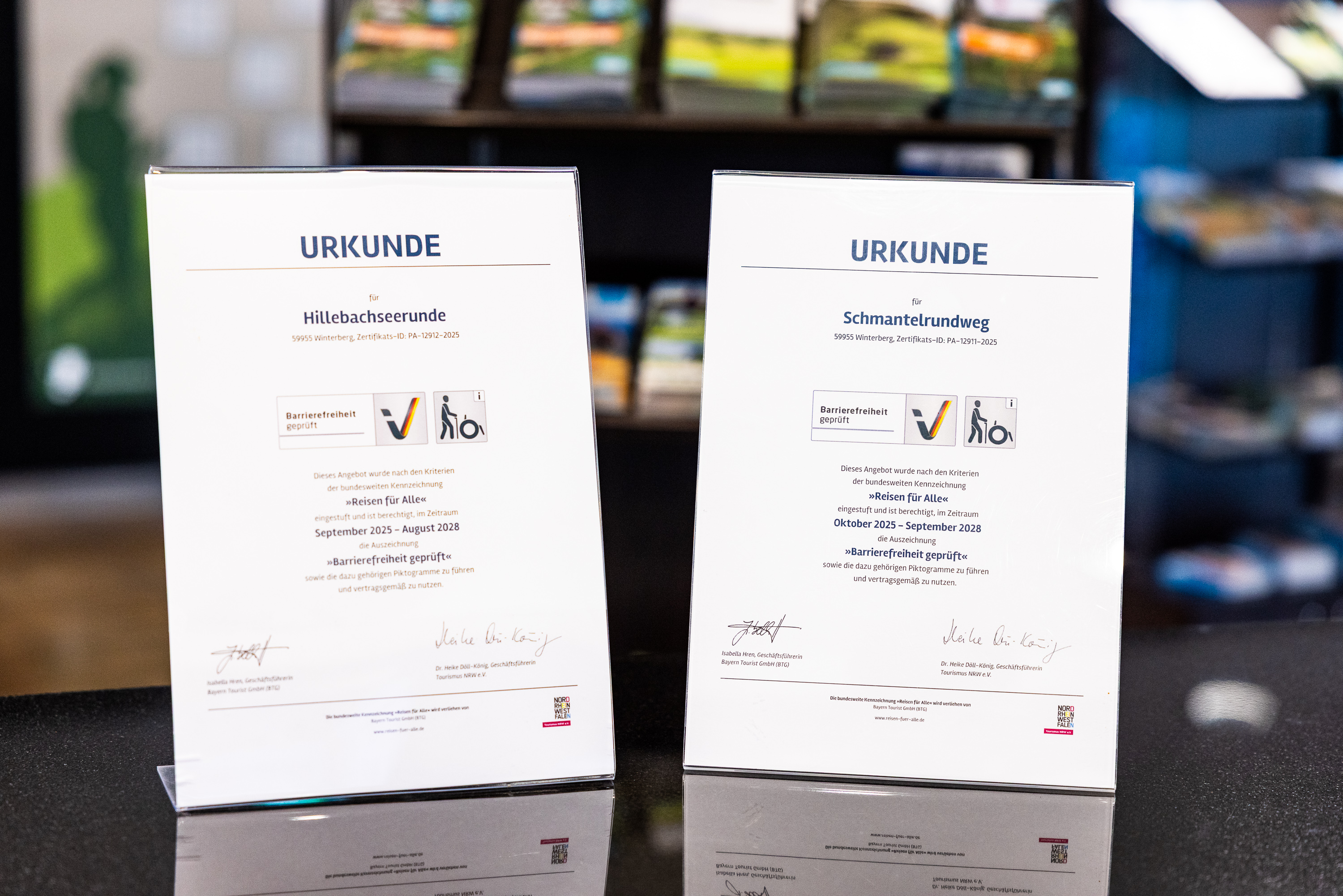 Winterberg/Niedersfeld. Zwei beliebte Wanderrouten in Winterberg haben erneut das bundesweite Zertifikat „Reisen für Alle" erhalten: Der Schmantelrundweg und die Hillbachseerunde sind mit dem Kennzeichen „Barrierefreiheit geprüft – teilweise barrierefrei für Menschen mit Gehbehinderung" ausgezeichnet worden. Damit können sich Wanderbegeisterte mit Mobilitätseinschränkungen auf verlässliche und detaillierte Informationen über die Beschaffenheit der Wege verlassen.