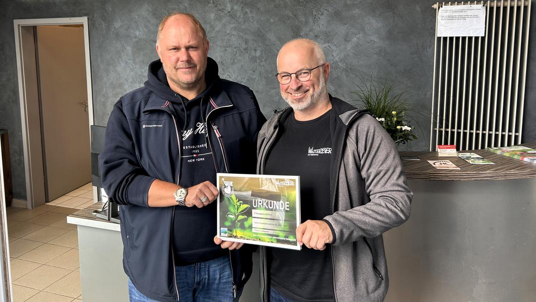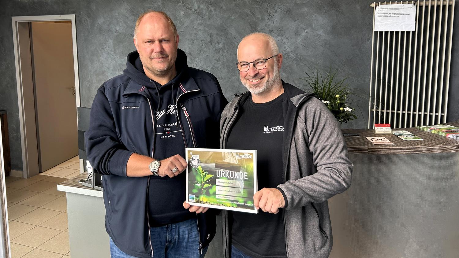 Winterberg. Das Winterberger Unternehmen Schütte Automobile hat zum 27‑jährigen Firmenbestehen ein nachhaltiges Zeichen gesetzt: Im Rahmen der Baumpaten-Aktion „Heute für Morgen pflanzen“ wurden 27 Setzlinge gepflanzt und damit gleichzeitig 27 Baumpatenschaften übernommen. Winterbergs Wirtschaftsförderer Winfried Borgmann gratulierte vor Ort und überreichte Geschäftsführer Mark Schütte die Urkunde.
