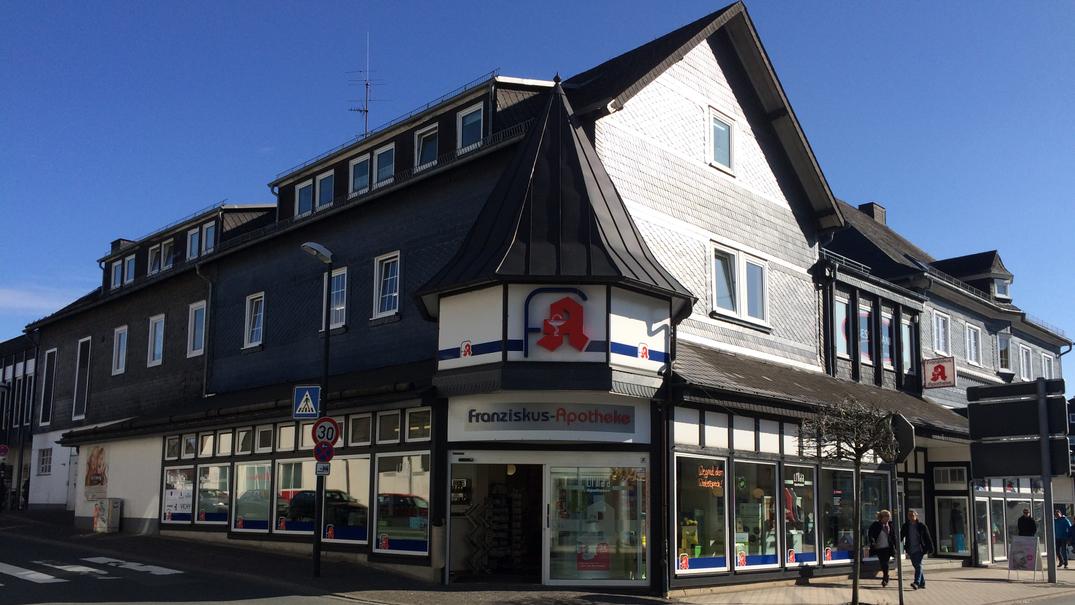 [email protected] ","website":"https:\/\/franziskus-apotheke-winterberg.de\/","name":"","additionalAddress":"","district":"","mobileNumber":"","contactEMail":""},"description":{"description":"","seasonalDescription":"","arrivalInformation":"","hygieneNoticeText":"","hygieneNoticeIUrl":""},"shortDescription":{"description":"","seasonalDescription":""},"currentMessage":{"message":""},"features":["688b22765606436da6a5bc93"],"pictures":[{"id":"68ef9b3bc3eb3fd401dac4ee","url":"https:\/\/download.eo-heimat.de\/pois\/2025\/2025-10-15\/68ef9b3bc3eb3fd401dac4ee.JPG","title":"IMG_4702.JPG","type":"always","print":"","showIn":"gallery","imageSizes":{"16:9":{"left":0,"right":0,"top":153,"bottom":459,"width":3264,"height":1836,"url":"https:\/\/download.eo-heimat.de\/focus\/0\/153\/3264\/1836\/pois\/2025\/2025-10-15\/68ef9b3bc3eb3fd401dac4ee.JPG"},"3:1":{"url":"https:\/\/download.eo-heimat.de\/focus\/0\/0\/3264\/1088\/pois\/2025\/2025-10-15\/68ef9b3bc3eb3fd401dac4ee.JPG"},"1:1":{"url":"https:\/\/download.eo-heimat.de\/focus\/0\/0\/2448\/2448\/pois\/2025\/2025-10-15\/68ef9b3bc3eb3fd401dac4ee.JPG"}},"customTypes":[],"customFileTypes":[]}],"files":[],"freeEntrance":false,"pricePackages":[{"services":[],"servicesDescription":"","description":""}],"openingHours":{"freeAccess":false,"description":{"description":"","seasonalDescription":""},"weekdays":[{"dayOfWeek":"Monday","active":true,"times":[{"from":"08:00","to":"19:00"}]},{"dayOfWeek":"Tuesday","active":true,"times":[{"from":"08:00","to":"19:00"}]},{"dayOfWeek":"Wednesday","active":true,"times":[{"from":"08:00","to":"19:00"}]},{"dayOfWeek":"Thursday","active":true,"times":[{"from":"08:00","to":"19:00"}]},{"dayOfWeek":"Friday","active":true,"times":[{"from":"08:00","to":"19:00"}]},{"dayOfWeek":"Saturday","active":true,"times":[{"from":"08:00","to":"14:00"}]},{"dayOfWeek":"Sunday","active":false,"times":[[]]}],"seasonalOpeningHours":[],"closedDays":[[]],"specialDays":[[]]},"highlight":false,"updatedBy":"6729e5c82ee9813dcb2db23f","online":[],"relatedPois":[],"additionalData":[],"regions":[],"excursionTickers":[],"dataSource":"Winterberg Touristik und Wirtschaft GmbH","deleted":false,"createdAt":"2025-06-06T08:52:09.703Z","updatedAt":"2025-10-15T13:04:20.731Z","contactPerson":{"name":"","title":"","phoneNumber":"","eMail":"","picture":{"type":"always","print":"","showIn":"gallery","customTypes":[],"customFileTypes":[]}},"exhibitions":[],"logo":"","feratelLogin":"","comment":"","searchText":"franziskus apotheke winterberg","calculatedOpeningHours":[[1764313200,1764352800],[1764399600,1764421200],[1764572400,1764612000],[1764658800,1764698400],[1764745200,1764784800],[1764831600,1764871200],[1764918000,1764957600],[1765004400,1765026000],[1765177200,1765216800],[1765263600,1765303200],[1765350000,1765389600],[1765436400,1765476000],[1765522800,1765562400],[1765609200,1765630800],[1765782000,1765821600],[1765868400,1765908000],[1765954800,1765994400],[1766041200,1766080800],[1766127600,1766167200],[1766214000,1766235600]],"license":[],"events_module":{"isOperator":false,"isLocation":false,"oploc_id":""},"conferenceInfos":{"completeRoomCount":0,"singleRoomCount":0,"doubleRoomCount":0,"moreBedsRoomCount":0,"minPersonsConference":0,"maxPersonsConference":0,"maxPersonsNight":0,"highlights":[],"rooms":[]},"currentOpenCloseTime":[1764313200,1764352800],"closestOpenCloseTime":[1764399600,1764421200],"currentOpeningTime":1764313200,"currentClosingTime":1764352800,"closestOpeningTime":1764399600,"stateOpen":2,"closestClosingTime":1764399600,"isOpen":true,"closesIn":3794,"opensIn":0,"fuzzyOpenCloseTime":false}