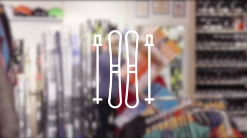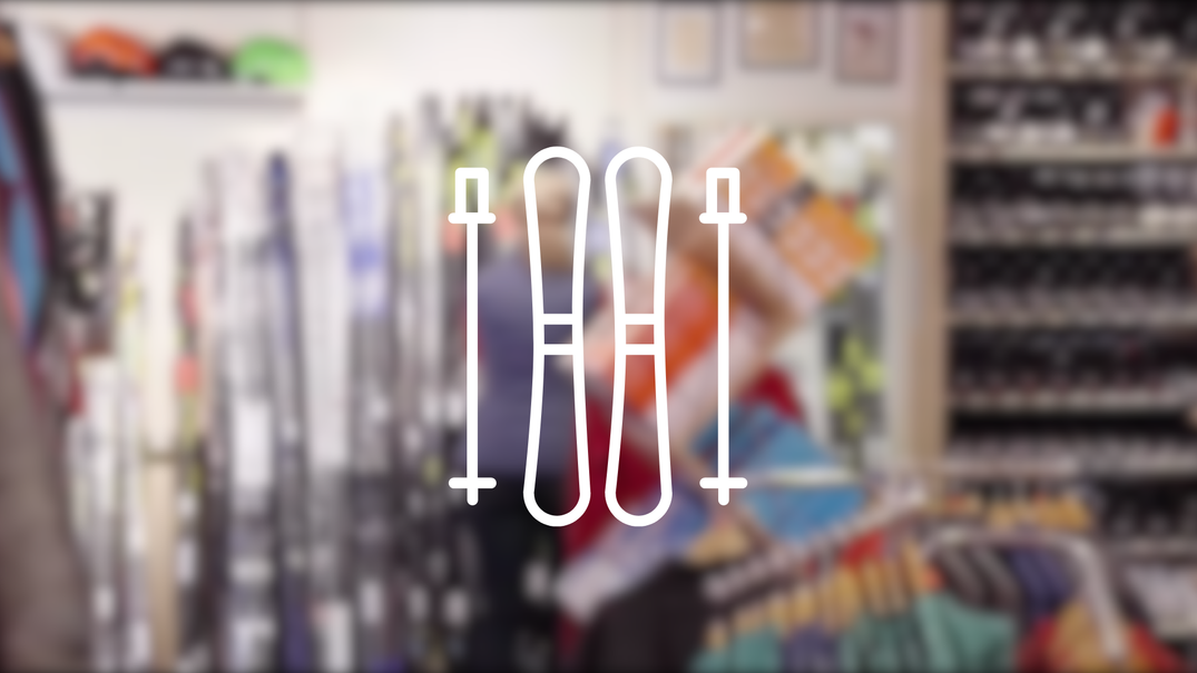 Ein verschwommenes Bild verschiedener Skiausrüstung mit der Zeichnung eines Paar Skiern mit Skistöcken im Vordergrund. Dieses Bild dient als Symbolbild für Skiverleihe.