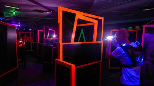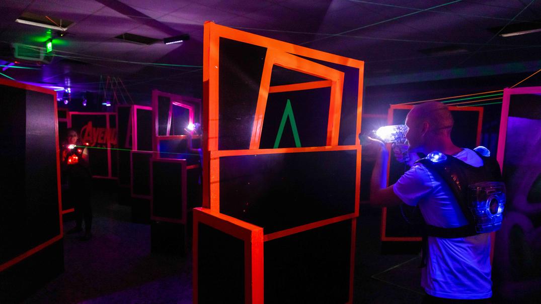 Ausgestattet mit einer Hightech-Spielausrüstung trittst Du in einem abgedunkelten Areal gegen andere Spieler an.
