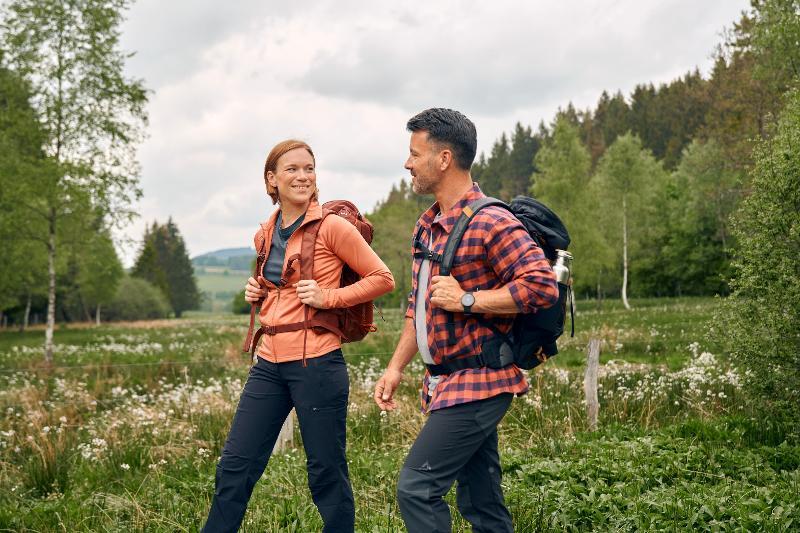 Die Wanderung hat insgesamt eine Strecke von 5,5 km und umfasst 160 Höhenmeter. Wir sind im gemäßigten Tempo unterwegs und starten taleinwärts. Am Hildfelder See vorbei und entlang von Weiden und Wiesen laufen wir, begleitet durch die Schweimecke, immer weiter in das Tal hinein. An Höhe gewinnend, biegen wir auf den Uplandsteig ab, der durch dichten Wald führt. Unterwegs sind gezielte Übungen zur Kräftigung und Mobilisation integriert.