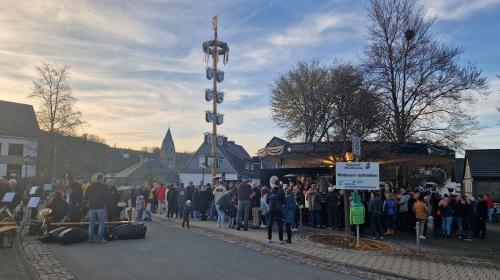 Der Musikverein „Negertalmusikanten“ Siedlinghausen e.V. läutet mit zünftiger Blasmusik, einem frisch gezapften Blonden und gegrillten Bratwürstchen den Mai ein. Das Dach des großen Warsteiner Emporiums bietet Platz für viele Besucher und Heizstrahler sorgen dafür, dass niemand frieren muss.