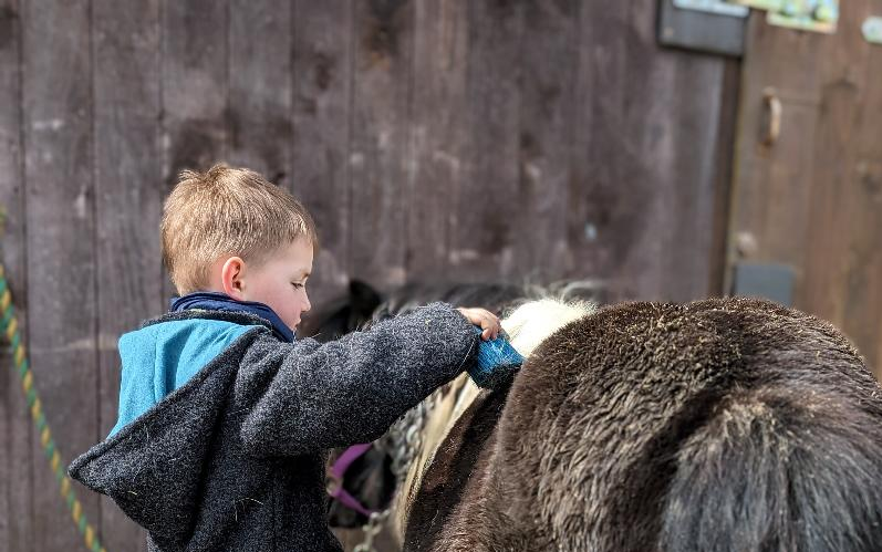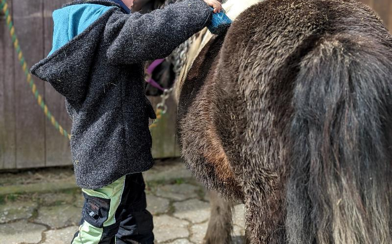 Gemeinsame Ponywanderung, bei der Kinder die Tiere führen und begleiten dürfen.